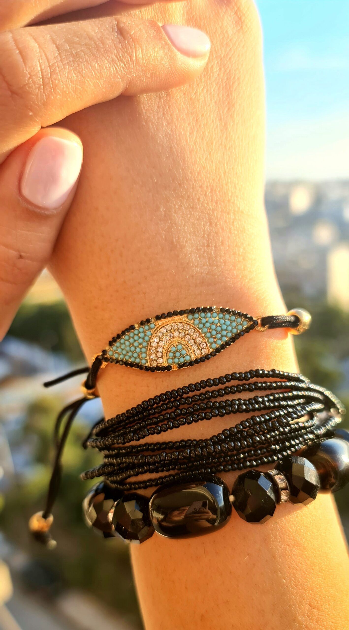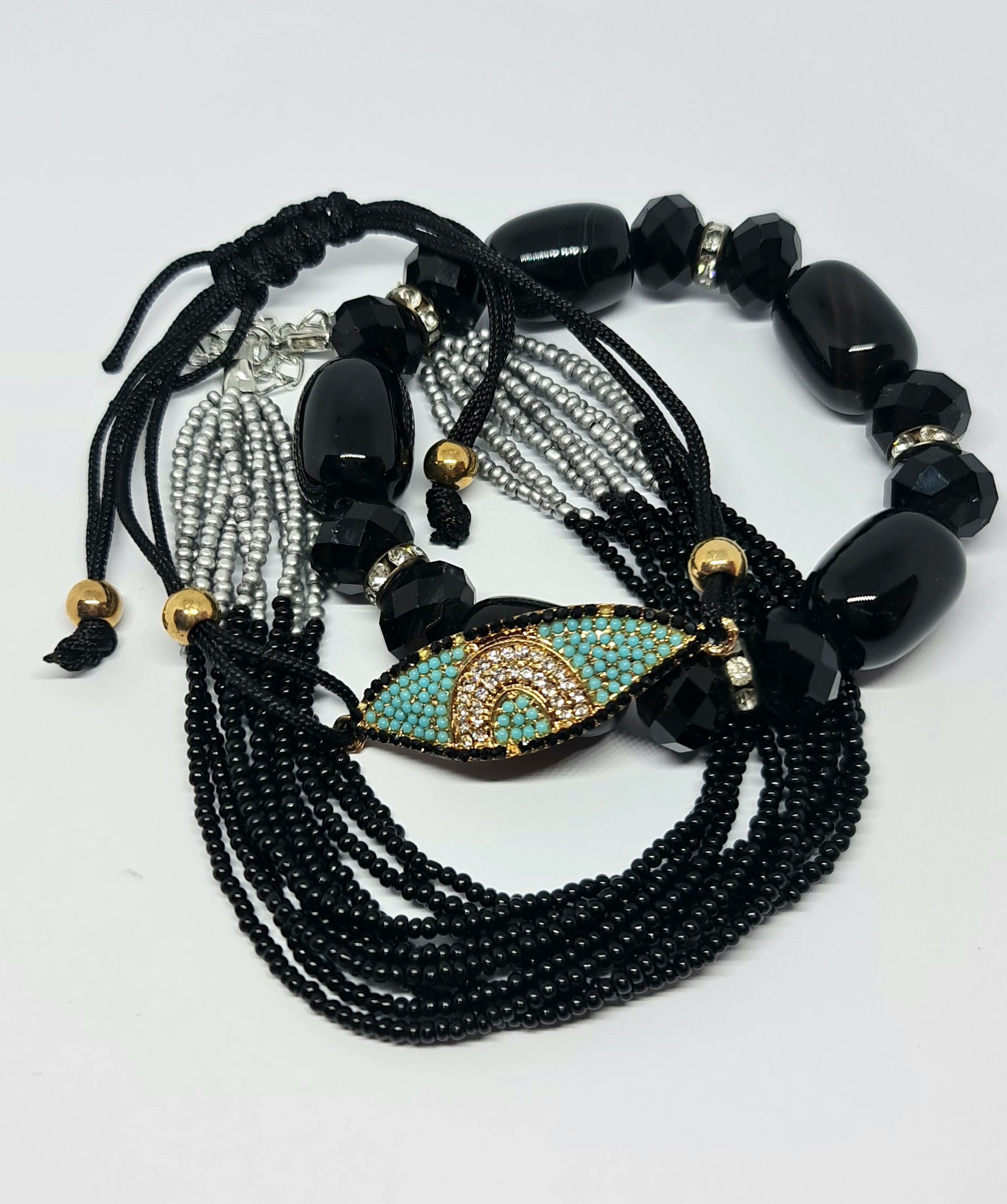 ΒΡΑΧΙΟΛΙ ΣΕΤ 3 ΤΕΜΑΧΙΩΝ ΣΕ ΤΟΝΟΥΣ ΧΡΥΣΟΥ ΤΙΡΚΟΥΑΖ & ΜΑΥΡΟΥ. Ταιριάζει άψογα σε καθημερινές και πιο ιδιαίτερες εμφανίσεις, μόνο του ή σε συνδυασμό με άλλα βραχιόλια.